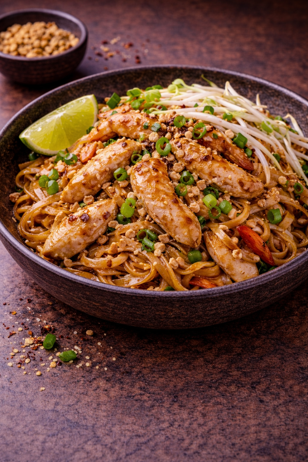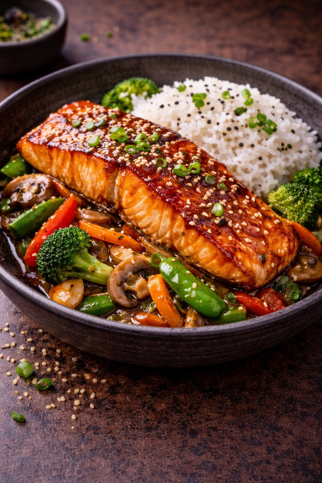 Soczysty kurczak w sosie teriyaki podawany na warzywach z woka z porcją ryżu.