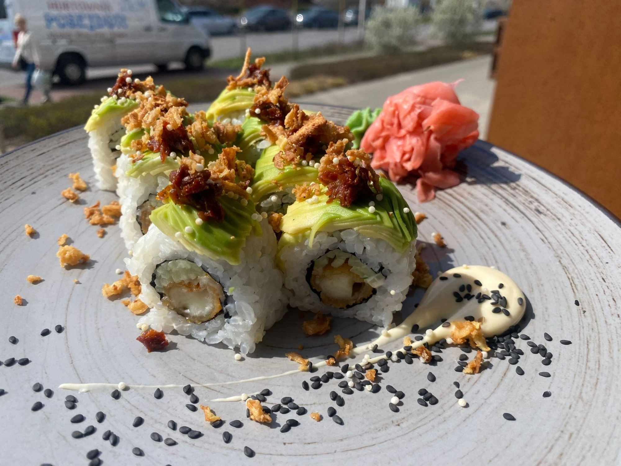 Chrupiący mozzarella stick, świeży ogórek i delikatny majonez w środku. Na wierzchu plasterki avocado, suszone pomidory, prażona cebulka i masago arare dla idealnego crunchu.